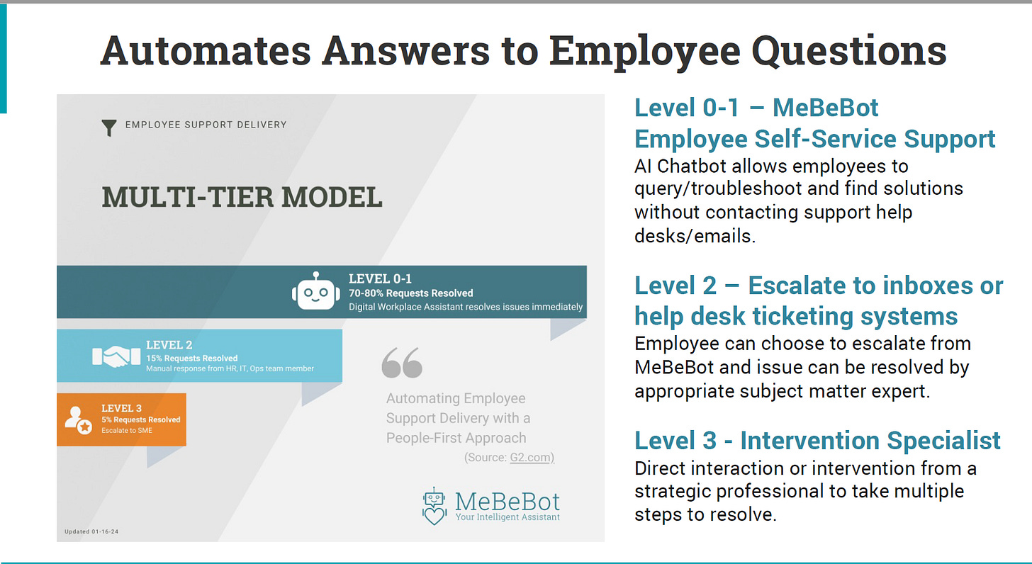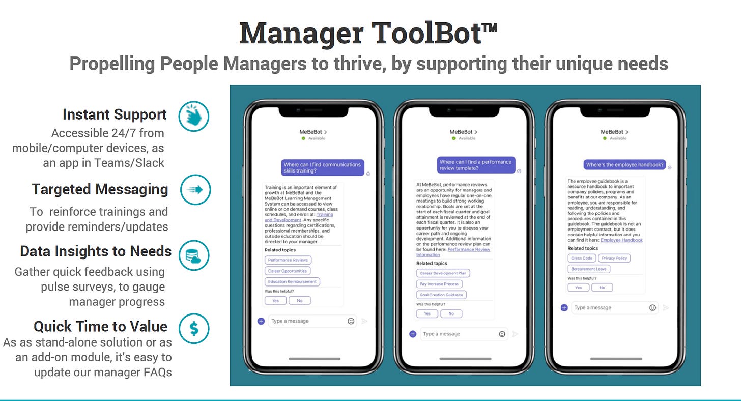 MeBeBot is like having an extra team member who’s always on call, 24/7 ready to answer all sorts of employee questions. Whether it’s about a training course, HR policies, or performance reviews, this chatbot handles the stuff that usually clogs up HR inboxes or “Help Desk Tickets”. It’s designed to take care of those repetitive questions, giving HR teams back at least 10% of their time annually.