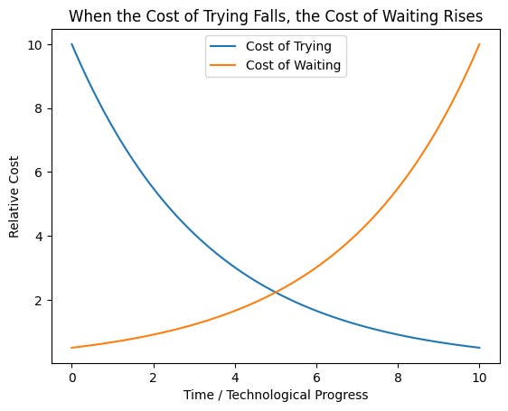 When the Cost of Trying Falls, the Cost of Waiting Rises